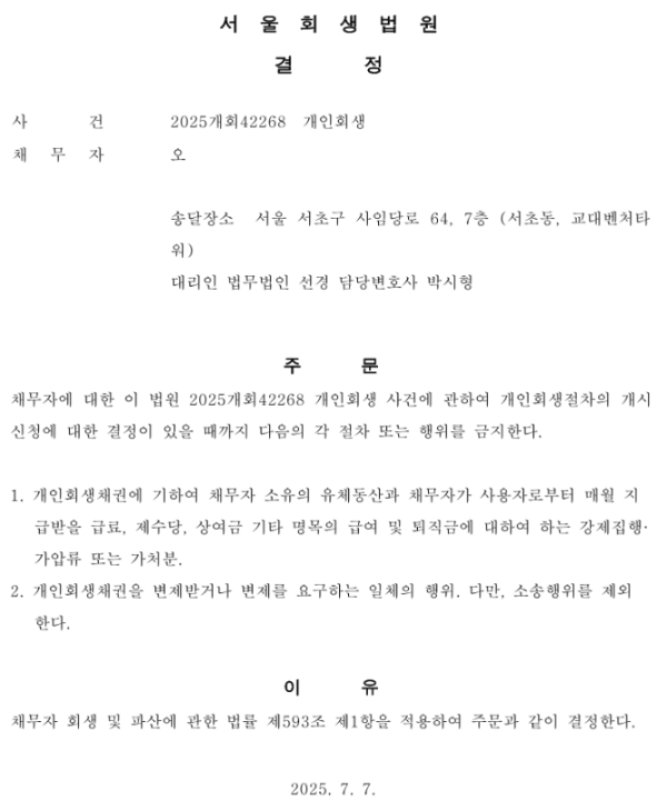 개인회생신청사건의 금지명령 결정문