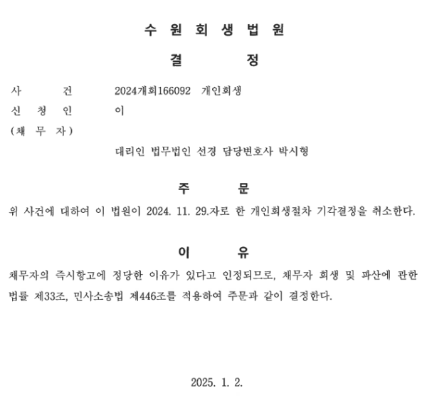 개인회생 기각취소결정