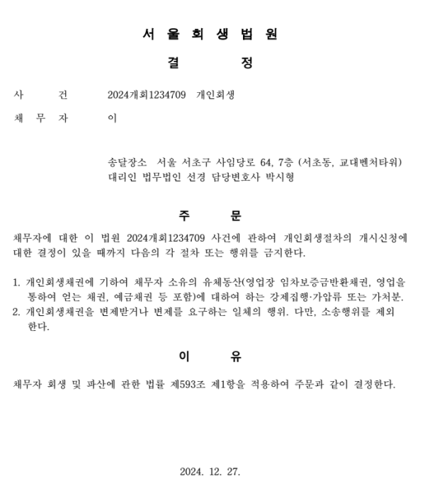 개인회생신청사건의 금지명령결정문