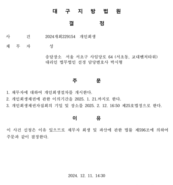 개인회생신청사건의 개시결정문
