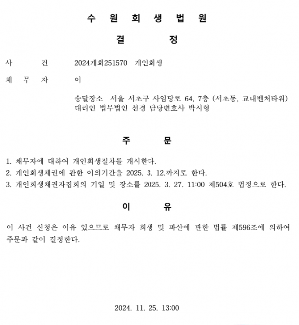 개인회생신청사건의 개시결정문