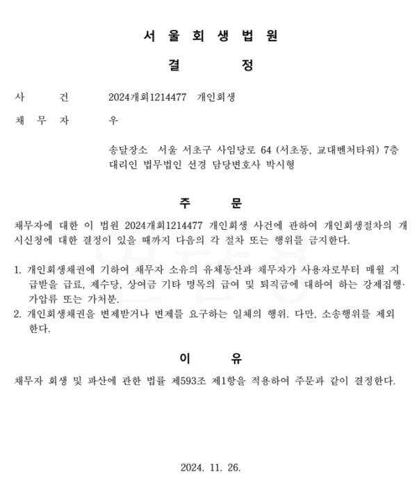 개인회생신청사건의 금지명령결정문