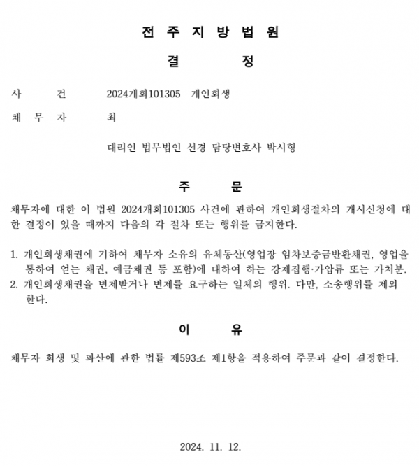 개인회생신청사건의 금지명령결정문