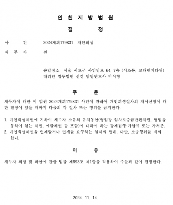 개인회생신청사건의 금지명령결정문