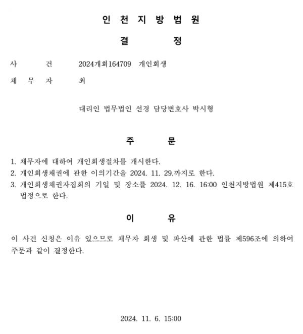 개인회생신청사건의 개시결정문