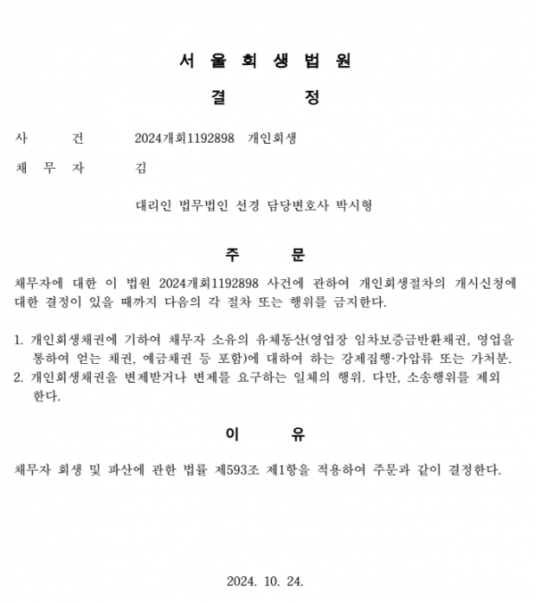 개인회생신청사건의 금지명령결정문