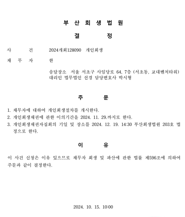 개인회생신청사건의 개시결정문