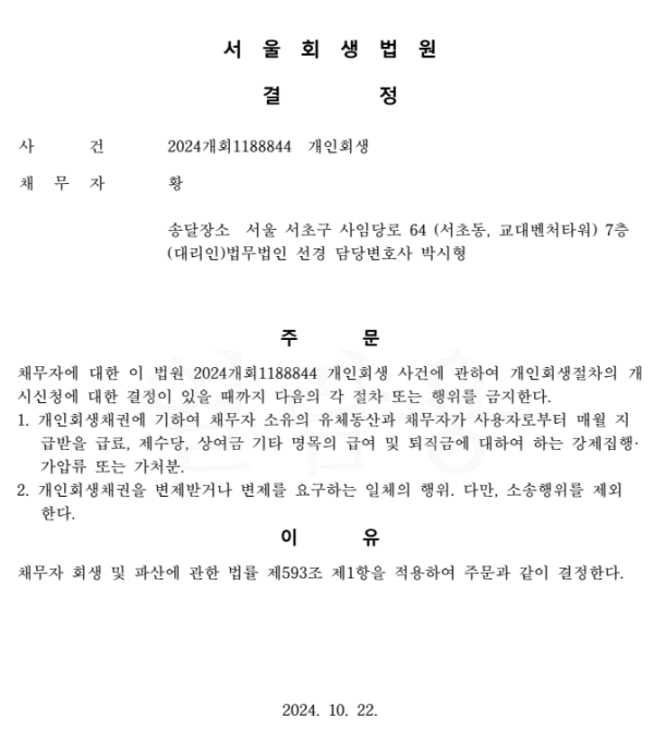 개인회생신청사건의 금지명령결정문