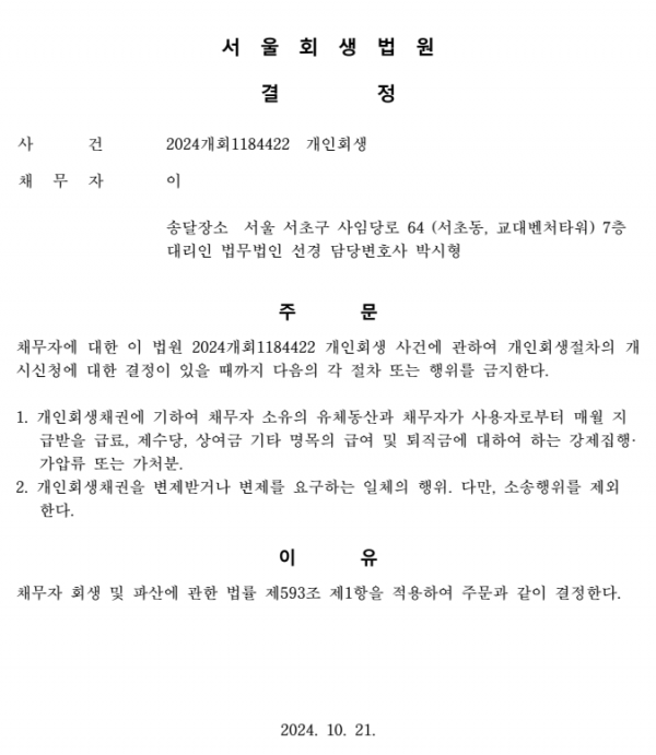 개인회생신청사건의 금지명령결정문