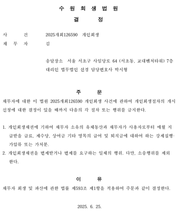 개인회생신청사건의 금지명령 결정문
