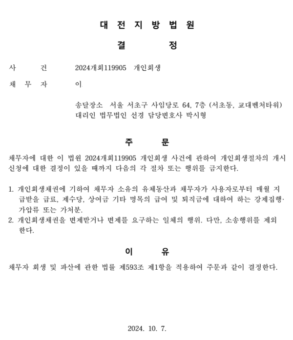 개인회생신청사건의 금지명령결정문