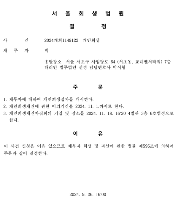 개인회생신청사건의 개시결정문
