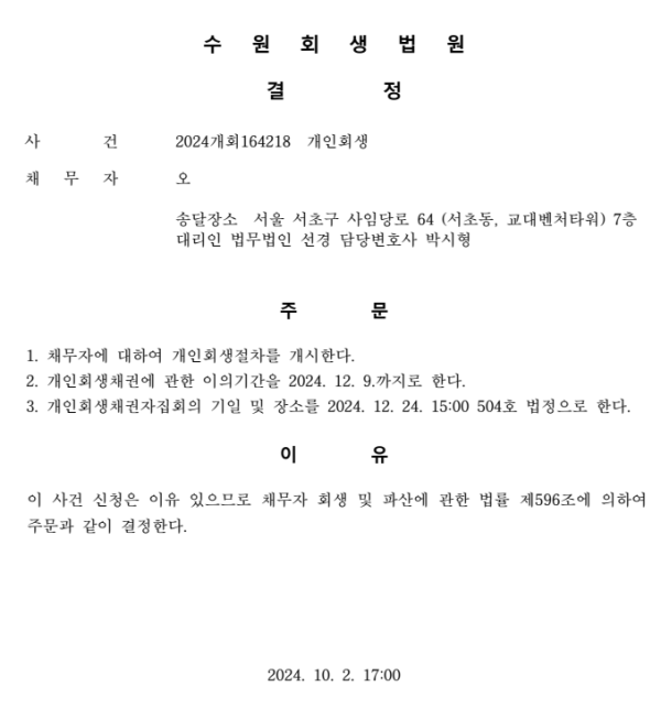 개인회생신청사건의 개시결정문