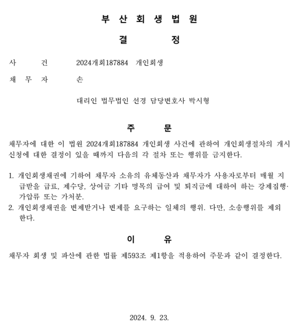 개인회생신청사건의 금지명령결정문