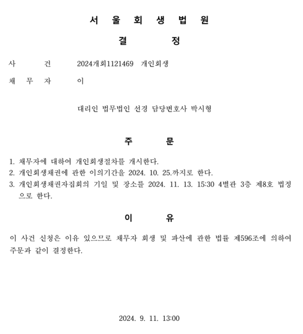 개인회생신청사건의 개시결정문