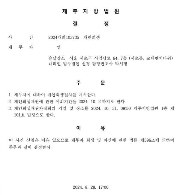 개인회생신청사건의 개시결정문