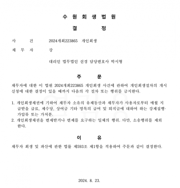 개인회생신청사건의 금지명령결정문