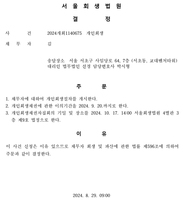 개인회생신청사건의 개시결정문