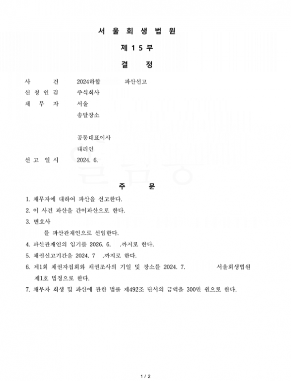 2024. 6 서울회생법원 법인파산 신청사건의 파산선고결정문