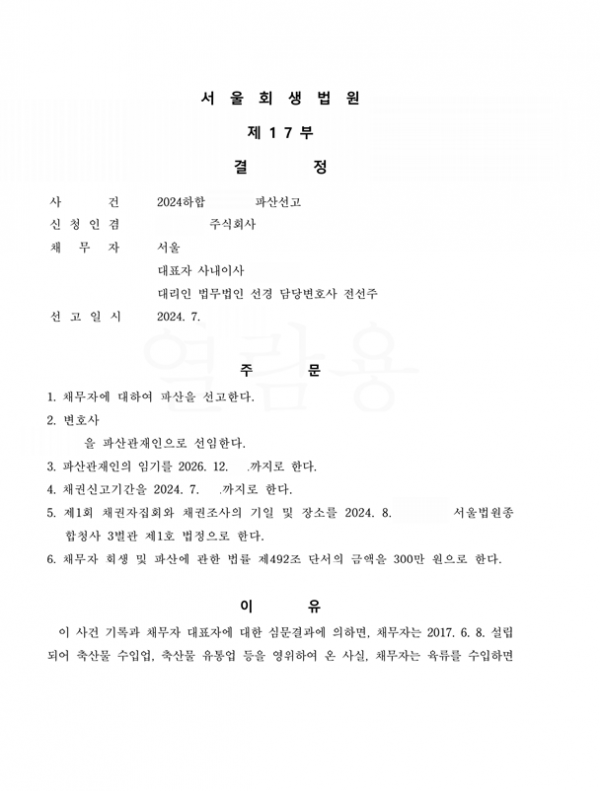 2024. 7 서울회생법원 법인파산 신청사건의 파산선고결정문