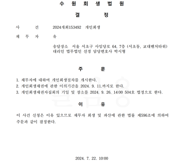 개인회생신청사건의 개시결정문