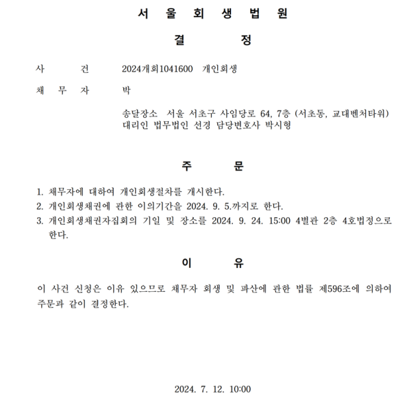 개인회생신청사건의 개시결정문