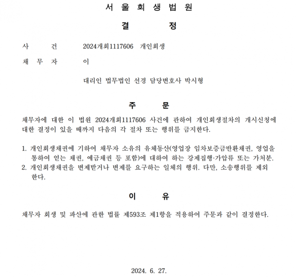 개인회생신청사건의 금지명령결정문