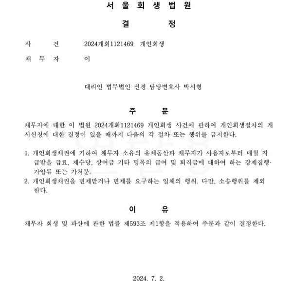 개인회생신청사건의 금지명령결정문