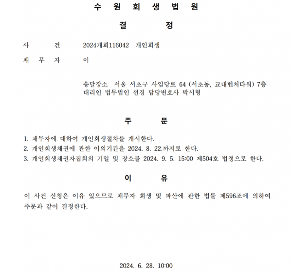 개인회생신청사건의 개시결정문