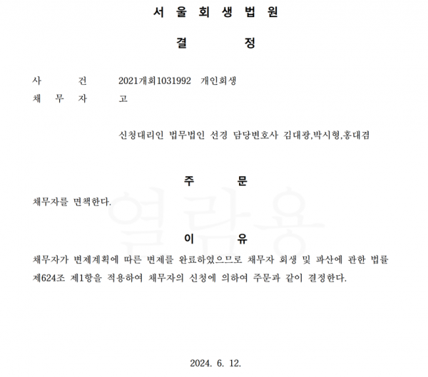 개인회생신청사건의 면책 결정문