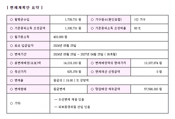 개인회생 개시결정 페이지 정보 최고관리자 작성일24-06-25 목록 본문 개인회생 개시결정2024. 6.서울회생법원개인회생신청사건의 개시결정문변제율 원금 19.80% 변제기간 36개월 목록