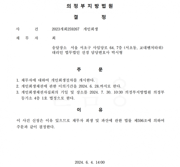 개인회생신청사건의 개시결정문