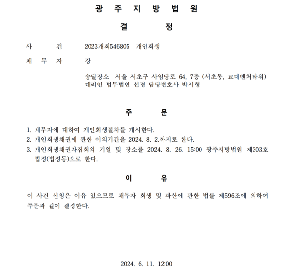 개인회생신청사건의 개시결정문