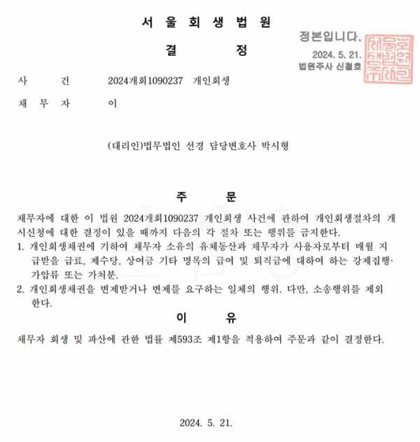 개인회생신청사건의 금지명령결정문