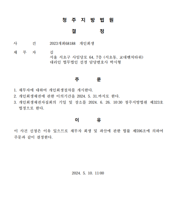 개인회생신청사건의 개시결정문