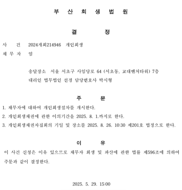 개인회생신청사건의 개시결정문