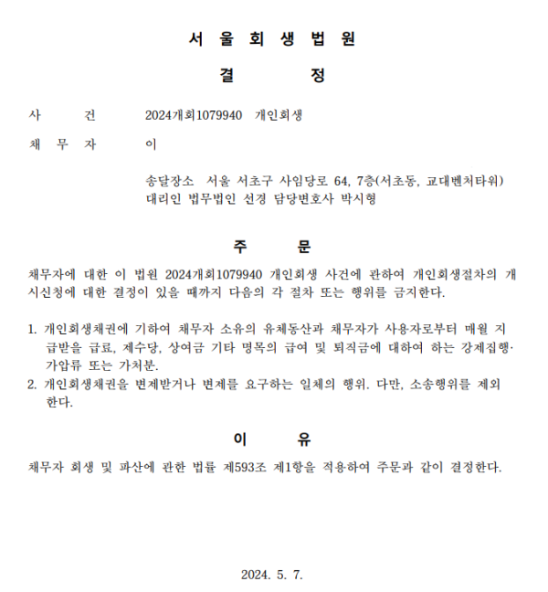 개인회생신청사건의 금지명령결정문