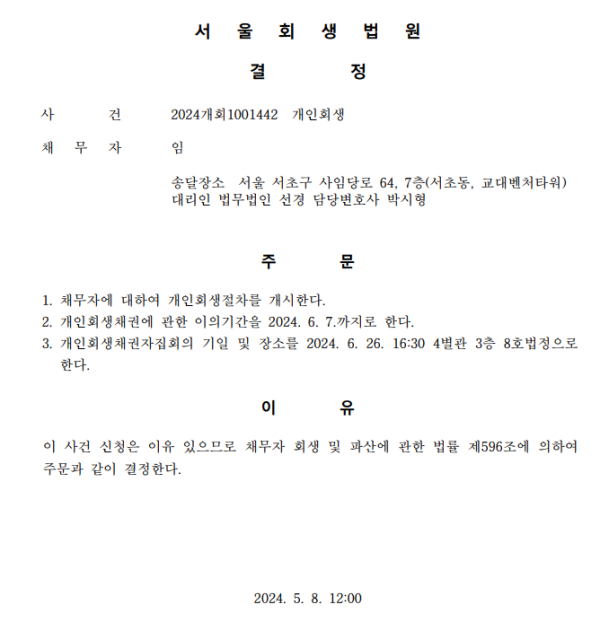 개인회생신청사건의 개시결정문
