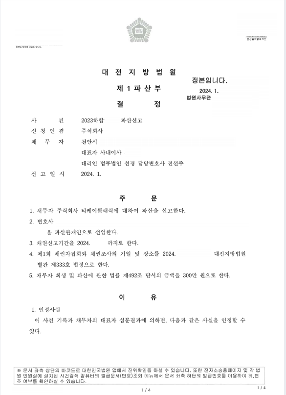 2024. 1. 대전지방법원 법인파산 신청사건의 파산선고결정문