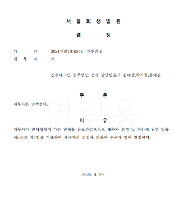 개인회생신청사건의 면책결정문
