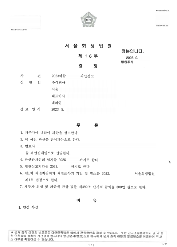 2023. 9. 서울회생법원 법인파산 신청사건의 파산선고결정문