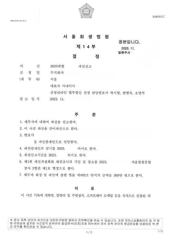 2023. 11. 서울회생법원 법인파산 신청사건의 파산선고결정문