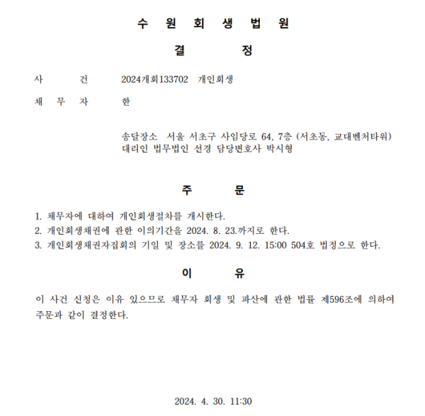 개인회생신청사건의 개시결정문