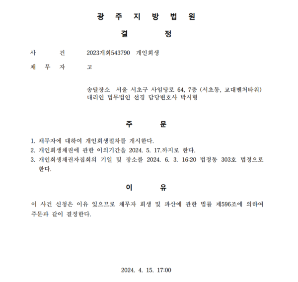 개인회생신청사건의 개시결정문