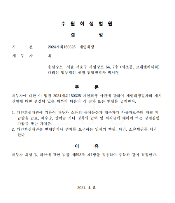 개인회생신청사건의 금지명령결정문