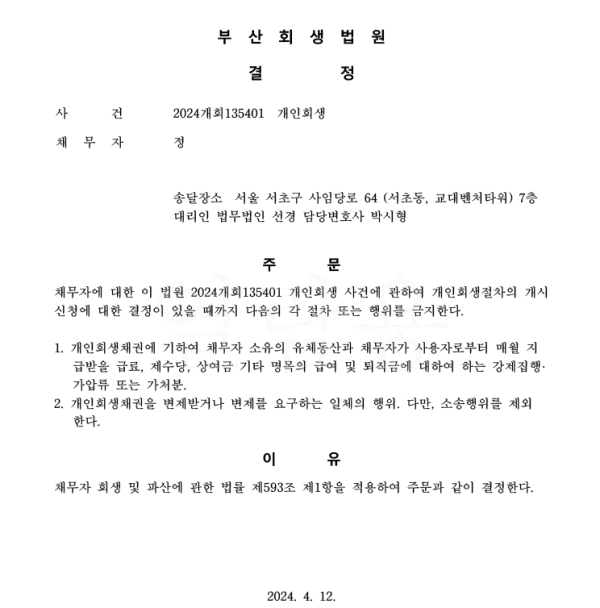 개인회생신청사건의 금지명령결정문