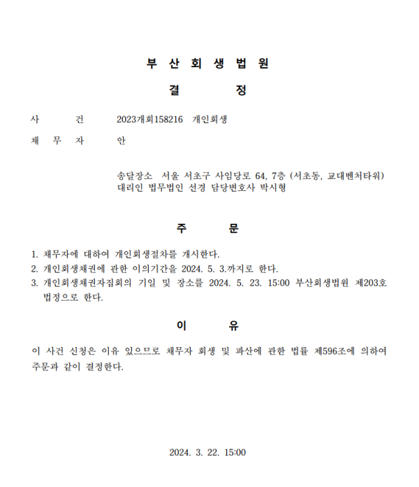 개인회생신청사건의 개시결정문