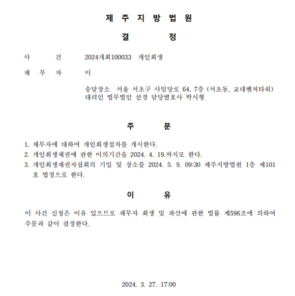 개인회생신청사건의 개시결정문