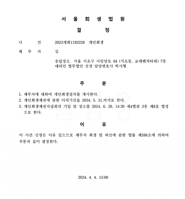 개인회생신청사건의 개시결정문