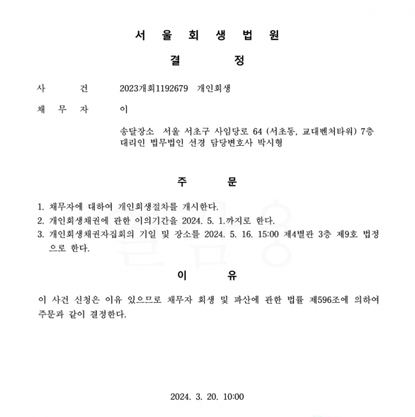 개인회생신청사건의 개시결정문